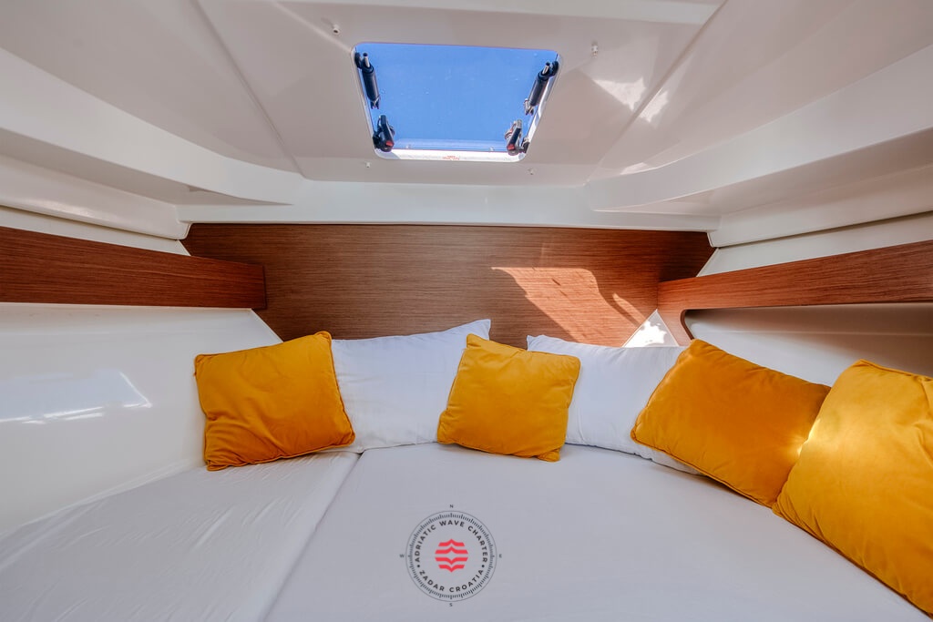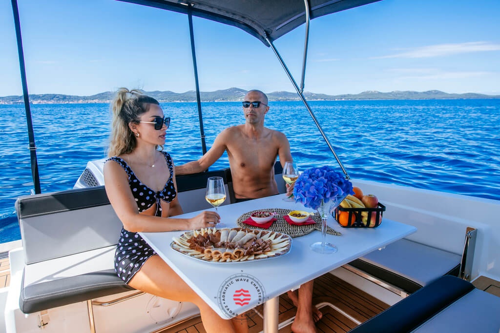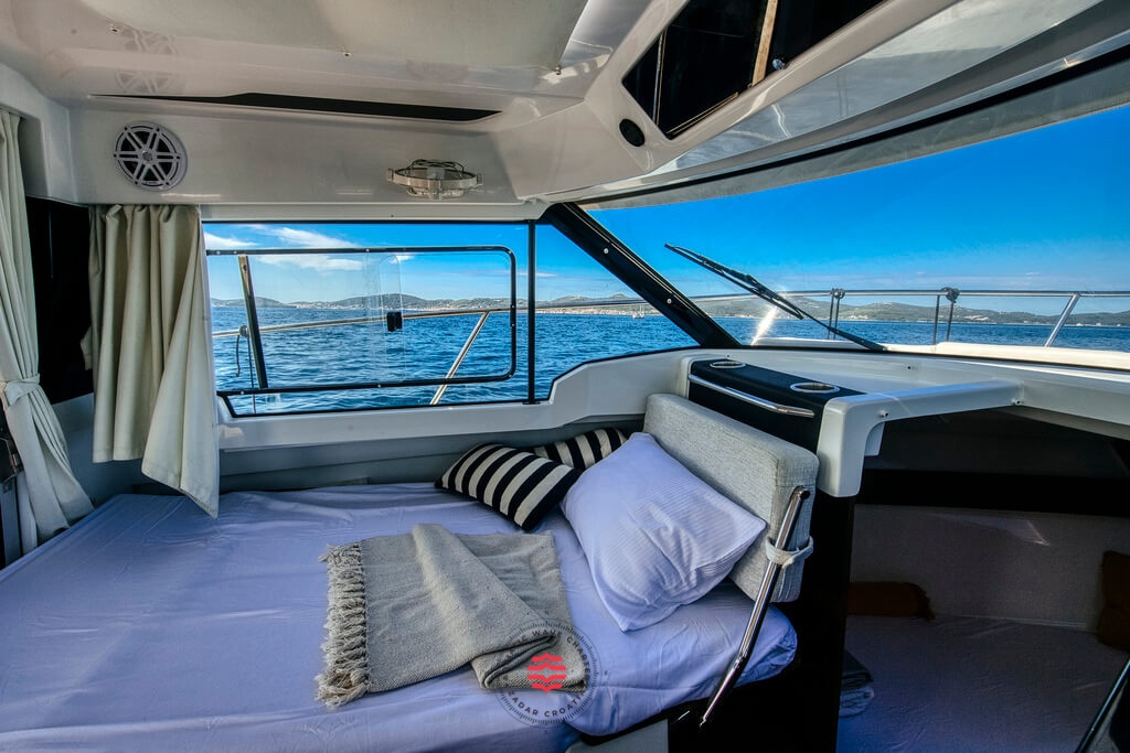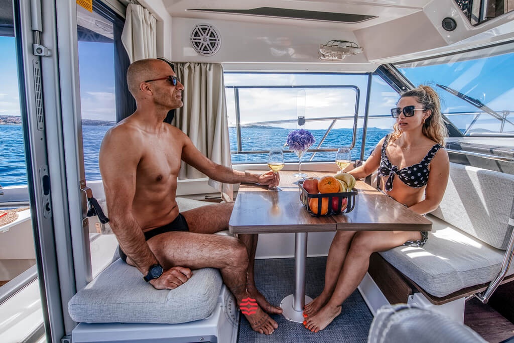 This boat is perfectly adapted for fun and a relaxing family cruising through our beautiful coast! Explore hidden places, swim in the clearest sea and enjoy all of the benefits this boat has to offer! If you don’t want to swim, you can just sit at the table on the deck, sip your coffee and enjoy breathtaking views! If you’re tired, don’t worry! The saloon can transform into a resting area, where you can take a nap while listening to the soothing sound of the waves.